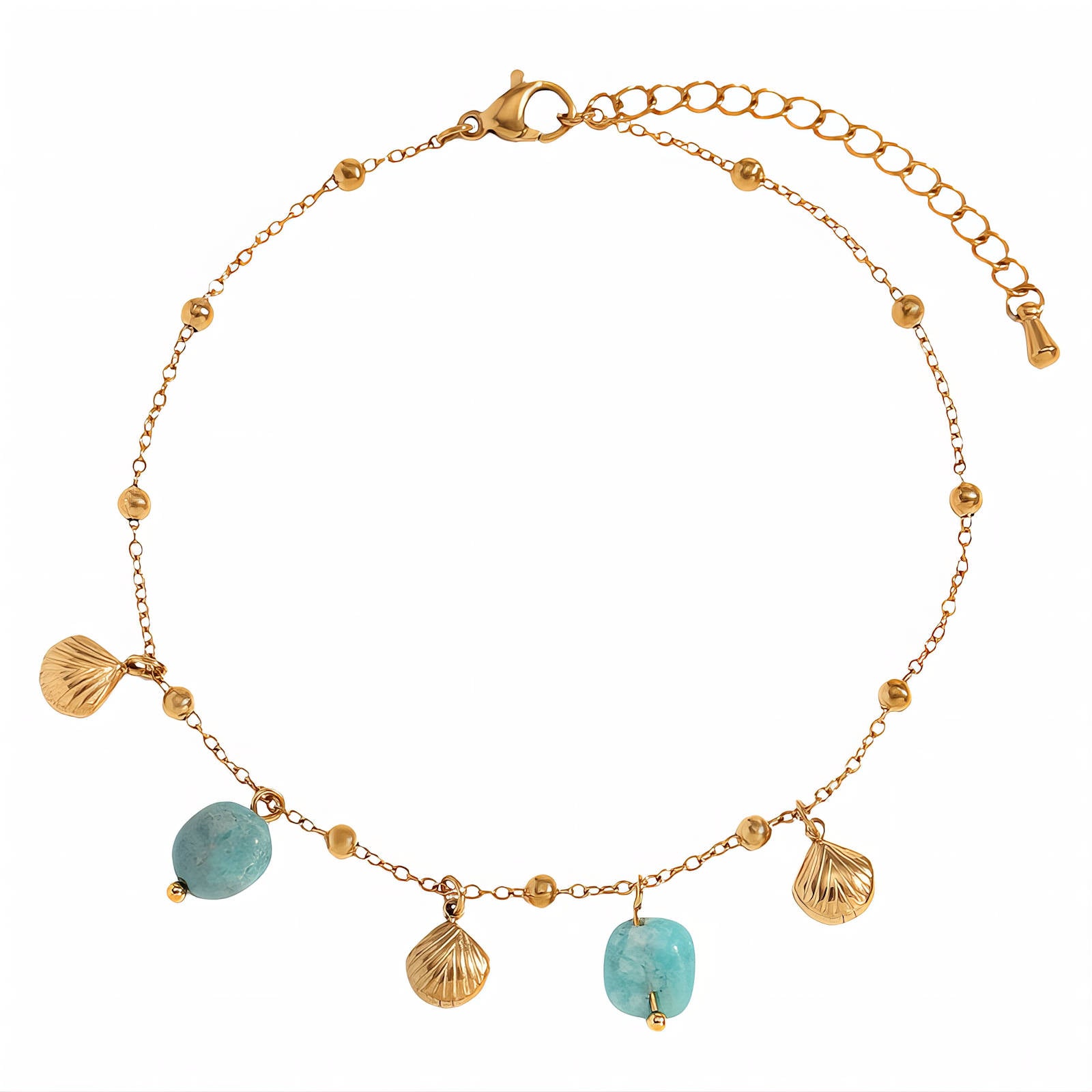 Feel empowered with a touch of oceanic magic as this anklet adorns your ankle. The radiant gleam of 18K gold, expertly plated over durable stainless steel, offers a sophisticated shimmer that complements any summer ensemble or brings a touch of coastal bliss to your everyday style. Experience the confidence that comes with wearing jewelry as resilient and beautiful as the sea itself.
